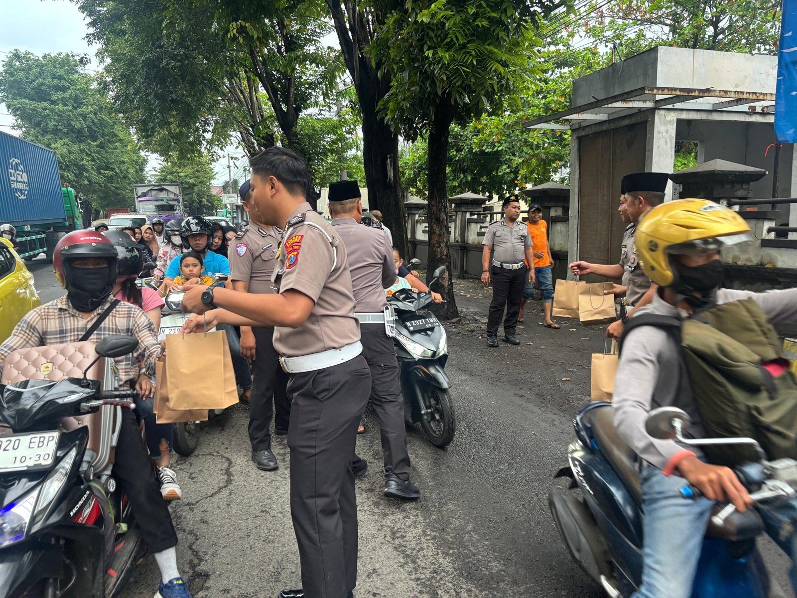 Personel Satlantas Polres Pasuruan tampak membagikan ratusan paket takjil kepada pengendara yang melintas. Dengan wajah ramah dan senyum ceria, mereka memberikan minuman dan makanan ringan kepada masyarakat yang tengah dalam perjalanan. Sambutan hangat pun terlihat dari senyum bahagia masyarakat yang menerima takjil tersebut.