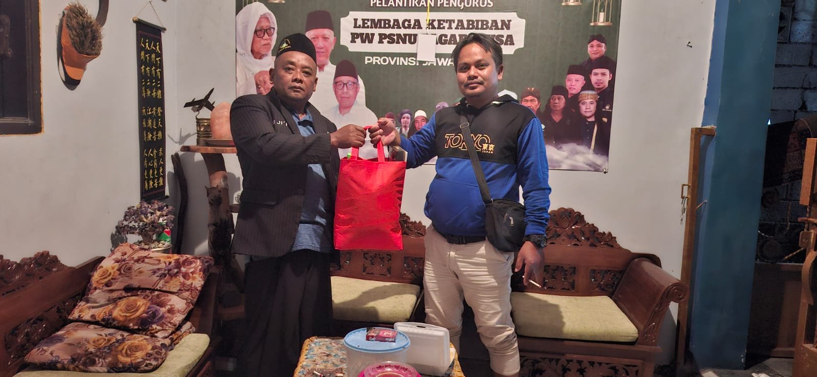 Gambar. Aba Sutarji saat memberikan bingkisan pada seorang jurnalis dari Media Kabarpresisi.com.(ist)