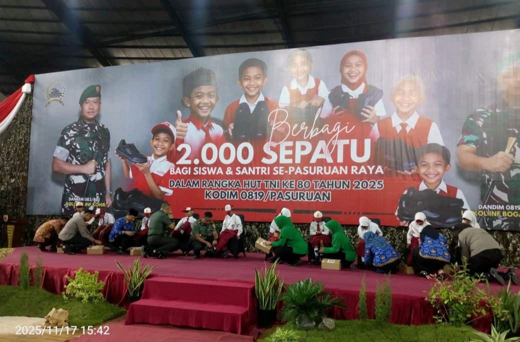 KOTA PASURUAN | KABARPRESISI – Dalam rangka memperingati HUT TNI ke-80 Tahun 2025, Kodim 0819/Pasuruan bersama Korem 083/BDJ menggelar kegiatan bakti sosial dengan membagikan 2.000 pasang sepatu baru kepada pelajar dan santri di wilayah Pasuruan Raya.