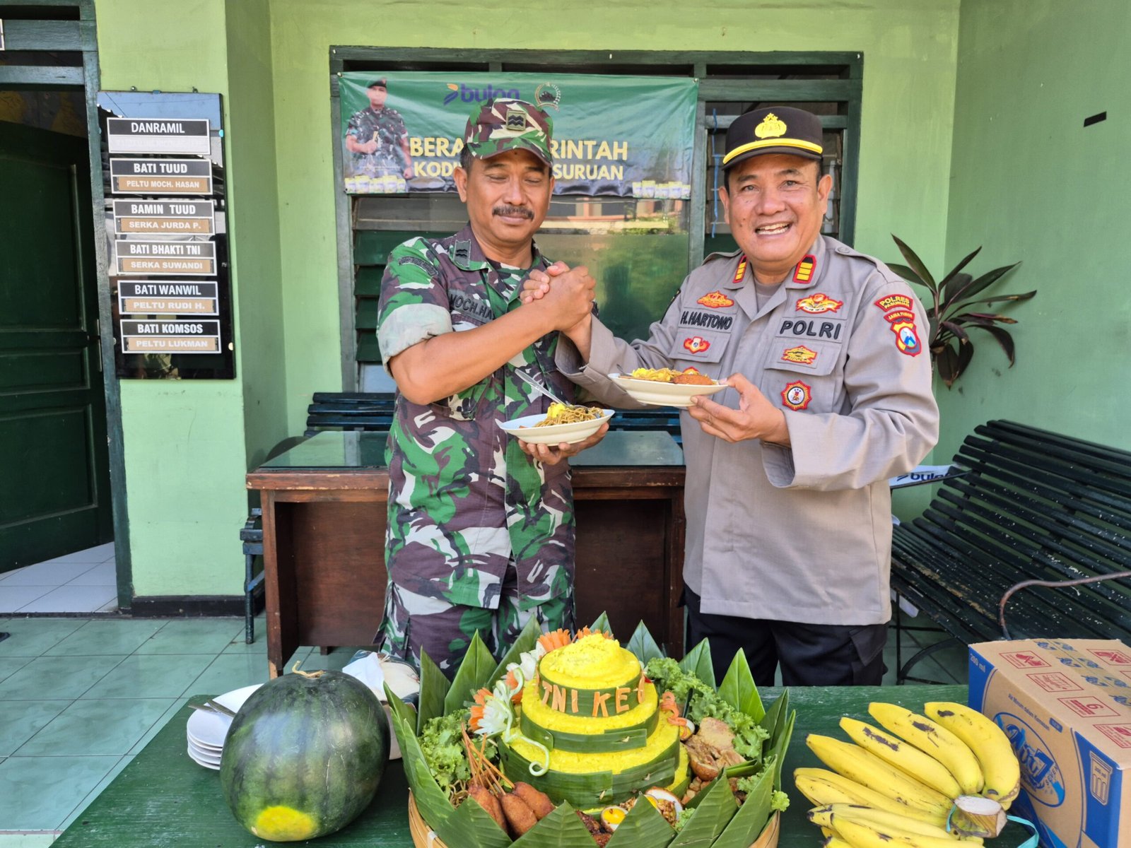 PASURUAN | KABARPRESISI – Polsek Prigen memberikan tumpeng spesial kepada Koramil 0819 Prigen di markasjya dalam rangka memperingati HUT TNI ke-80, Minggu (5/10/2025).